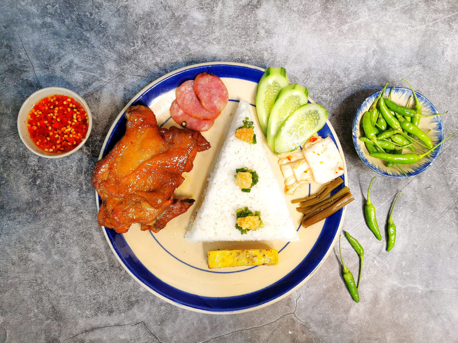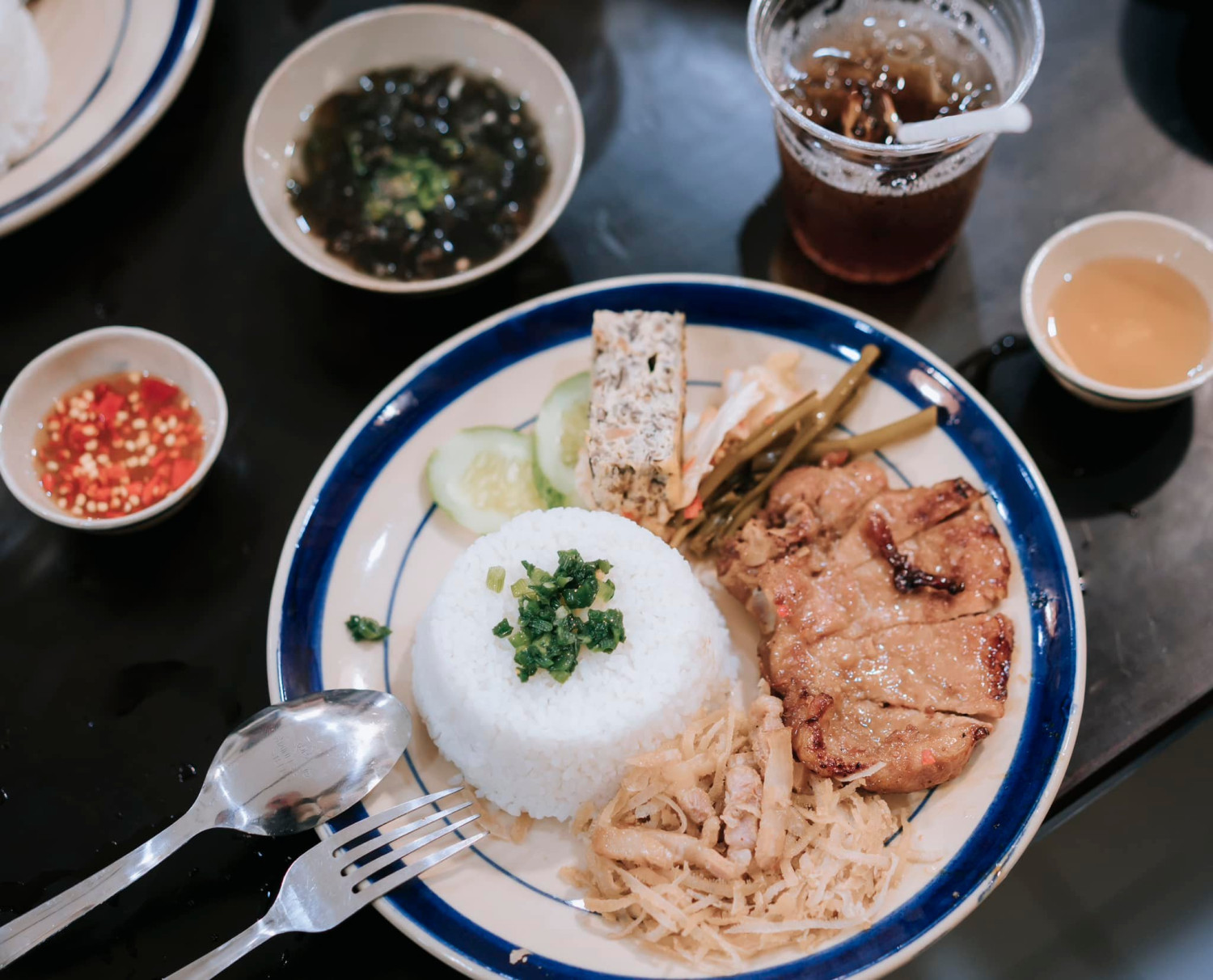 Đồ ăn kèm tinh tế: Chả trứng béo ngậy, bì thính thơm bùi, hòa quyện cùng chén nước mắm chua ngọt kẹo quánh – thứ "nước cốt" làm nên linh hồn của đĩa cơm tấm truyền thống.