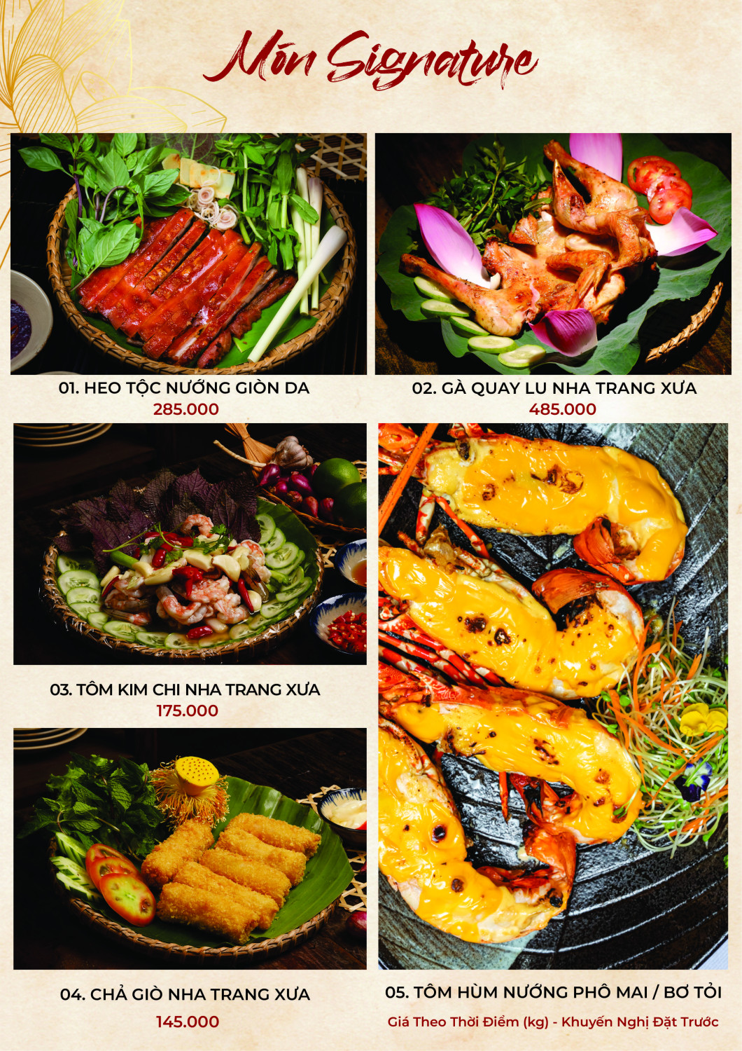 Thực đơn tại Nha Trang Xưa tập trung vào các món ăn truyền thống Việt Nam và đặc sản của vùng Khánh Hòa, được chế biến mộc mạc, tinh tế.